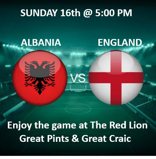ALBANIA v ENGLAND Sunday 16th @ 5:00 pm Enjoy the game at The Red Lion