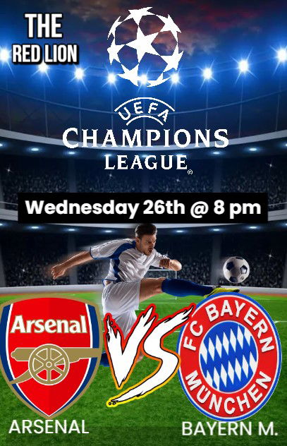 ARSENAL v BAYERN MUNICh Wednesday 26th @ 8 pm Enjoy the game at The Red Lion