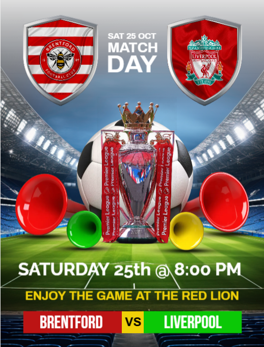 BRENTFORD v LIVERPOOL Saturday 25th Oct @ 8:00 pm Enjoy the game at The Red Lion