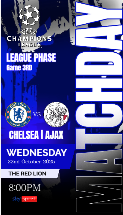 CHELSEA v AJAX Wednesday 22nd @ 8:00 pm Enjoy the game at The Red Lion