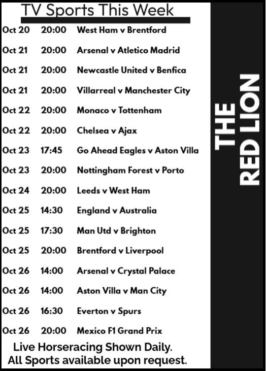 Some great sporting action available to view at The Red Lion this week including Premier League & European Football, Action from the European Darts Championship, Golf, F1 racing and live horseracing shown daily. All other sports available upon request. Just ask.