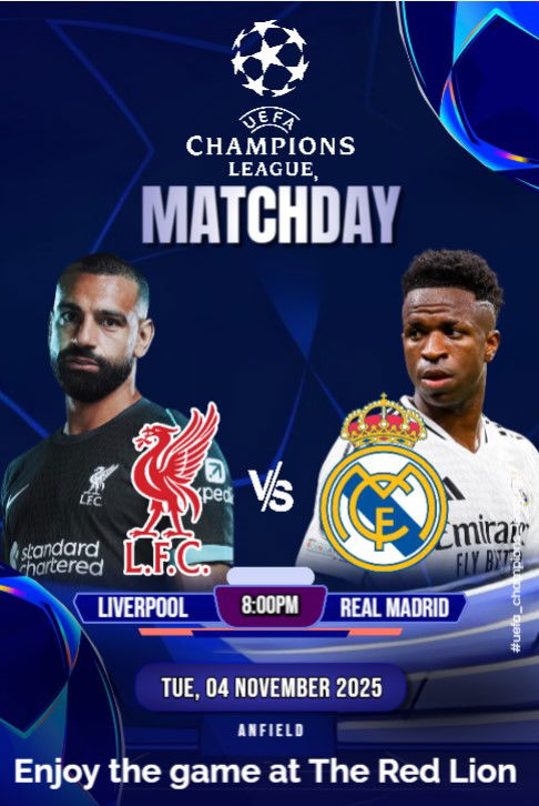 LIVERPOOL v REAL MADRID Tuesday 4th Nov @ 8:00 pm Enjoy the game at The Red Lion
