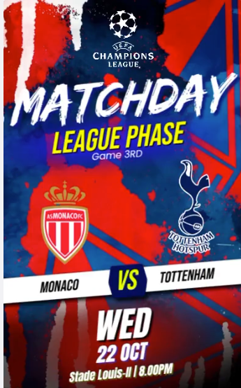 MONACO v SPURS Wednesday 22nd @ 8:00 pm Enjoy the game at The Red Lion
