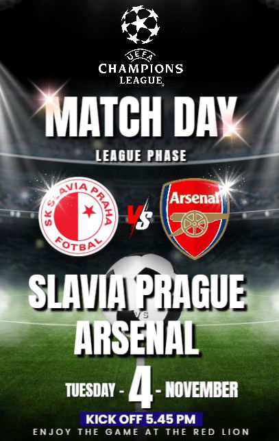 Slavia Prague v Arsenal Tuesday 4th Nov @ 5:45 pm Enjoy the game at The Red Lion