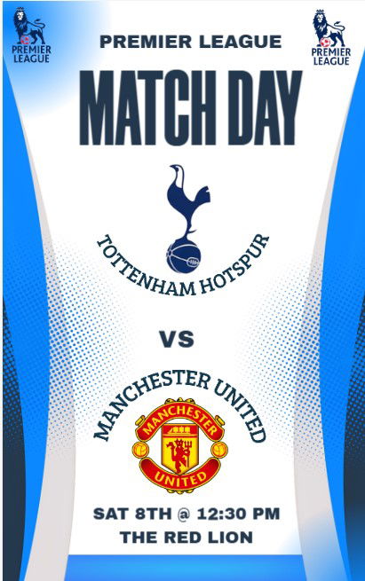 SPURS v MANCHESTER UNITED Saturday 8th @ 12:30 pm Enjoy the game at The Red Lion